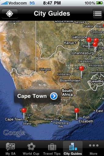 My South Africa Essentials présente aussi une carte du pays où les grandes villes d'Afrique du sud sont pointées. Un tap et vous accédez aux lieux touristiques à ne pas manquer, une page d'histoire pour en savoir plus, les endroits branchés où boire un verre et manger un morceau, les activités sportives à pratiquer, etc.