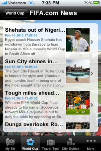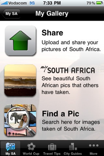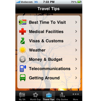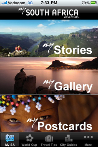 My South Africa Essentials regroupe plusieurs types d'informations. Pèle-mêle, vous pouvez partager histoires et photos de votre voyage sur une page internet consultable par tous, obtenir des informations essentielles sur la monnaie, les visas, la météo, consulter les infos touristiques sur les plus grandes villes du pays, ou bien, si c'es pour le sport que vous êtes là, accéder aux résultats, classements et programmes de la Coupe du monde FIFA, et bien d'autres encore.